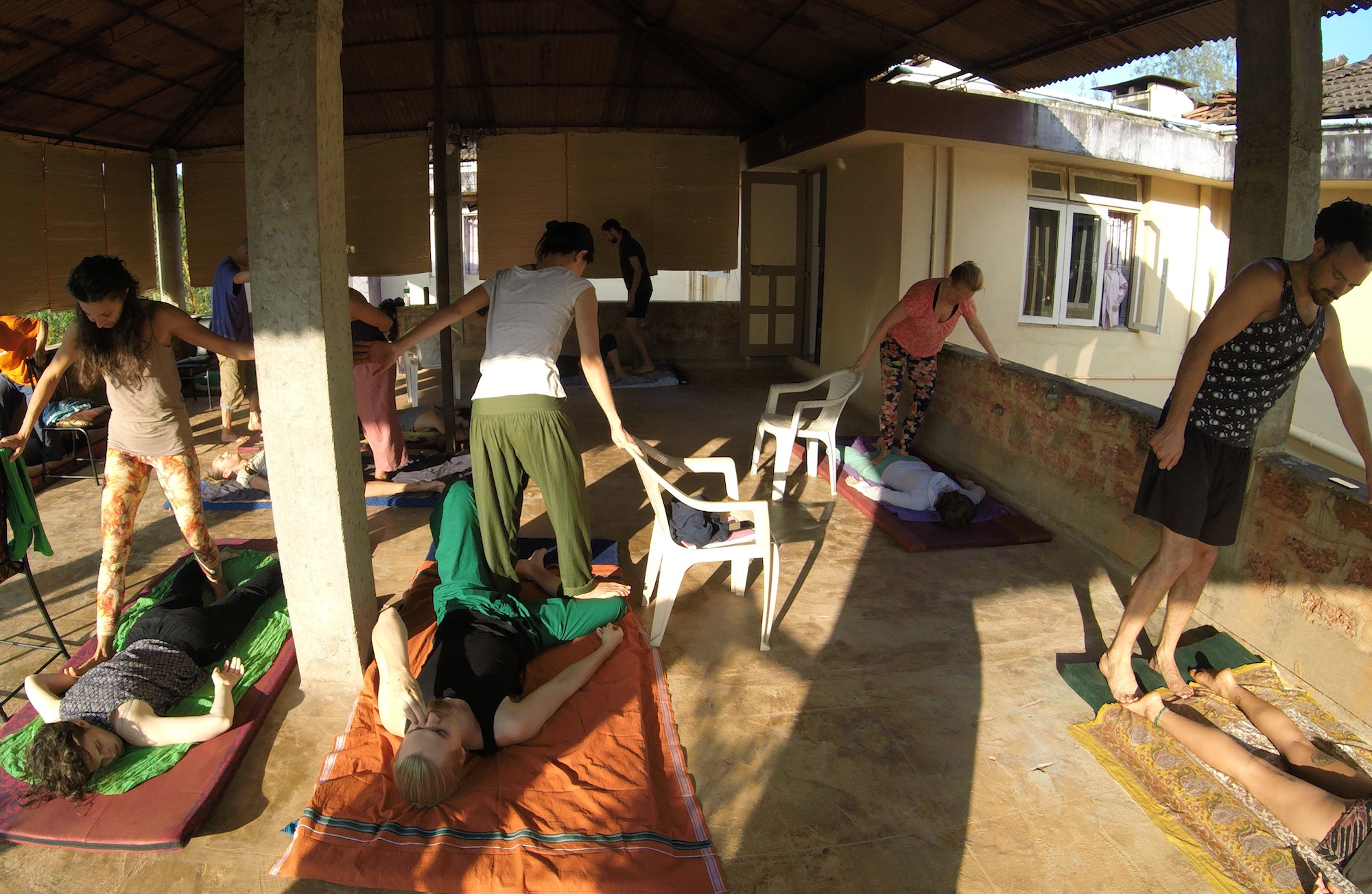 アシュラムでは、毎朝マッサージを行っています。これは、アーユルヴェーダの概念に基づいたものです。アーユルヴェーダはタントラ哲学やヨガにおいて、体の観点を学ぶときに必須となる伝統医学/科学です。足の裏を使って全身を気持ちよくマッサージしてゆきます。毎日行っていると足(+自分の身体)を器用に使えるようになります。また、体の構造も自然と学んでゆくことができます。でも、それより何より、心や身体の凝りがとれて、気の流れがスムーズになっていきます。