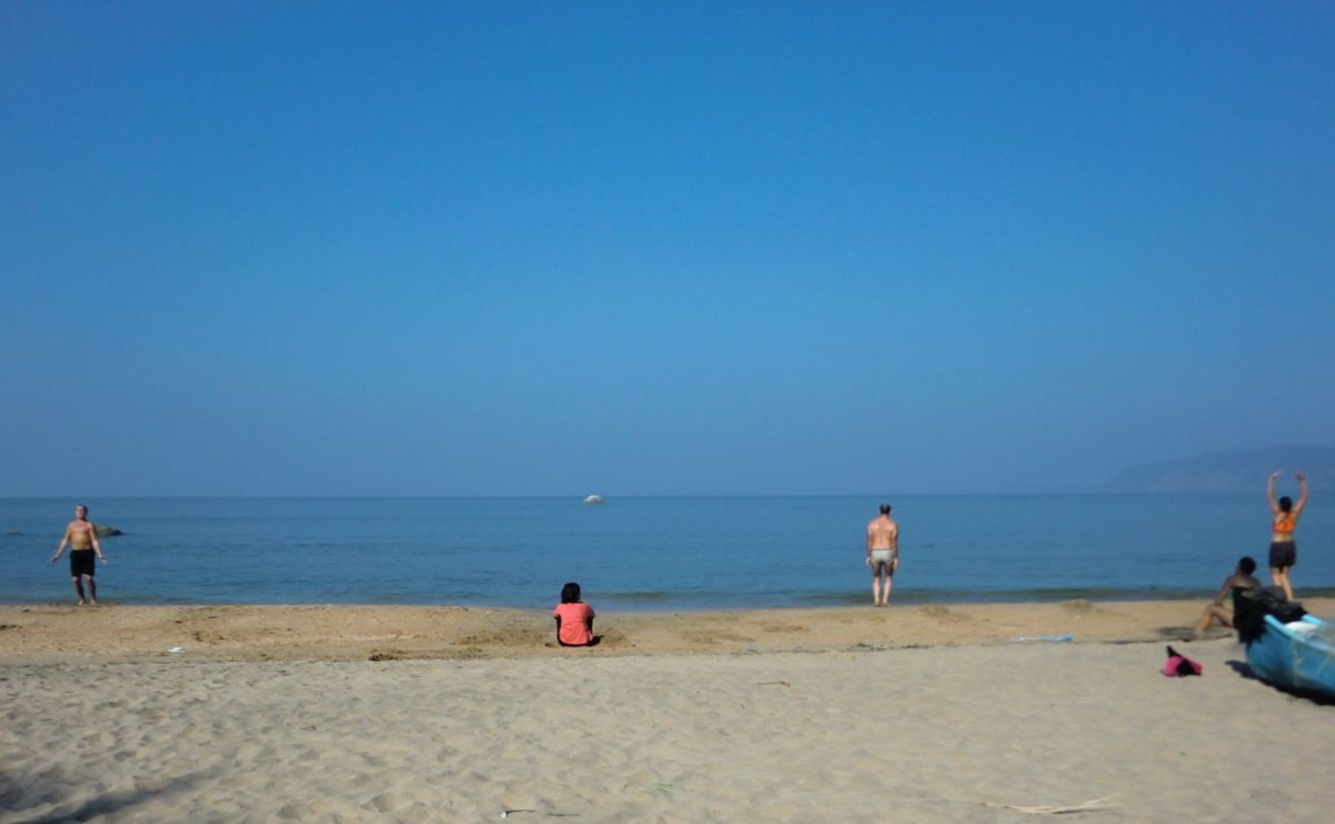 でも、あの頃はまだ体が養われていなかったのでビーチ練習はきつかった~。以下の写真はアゴンダのビーチで疲れて座り込む私。今や和歌山TTのビーチ練習では「もっともっと~」とみんなを駆り立てているのにねぇ。