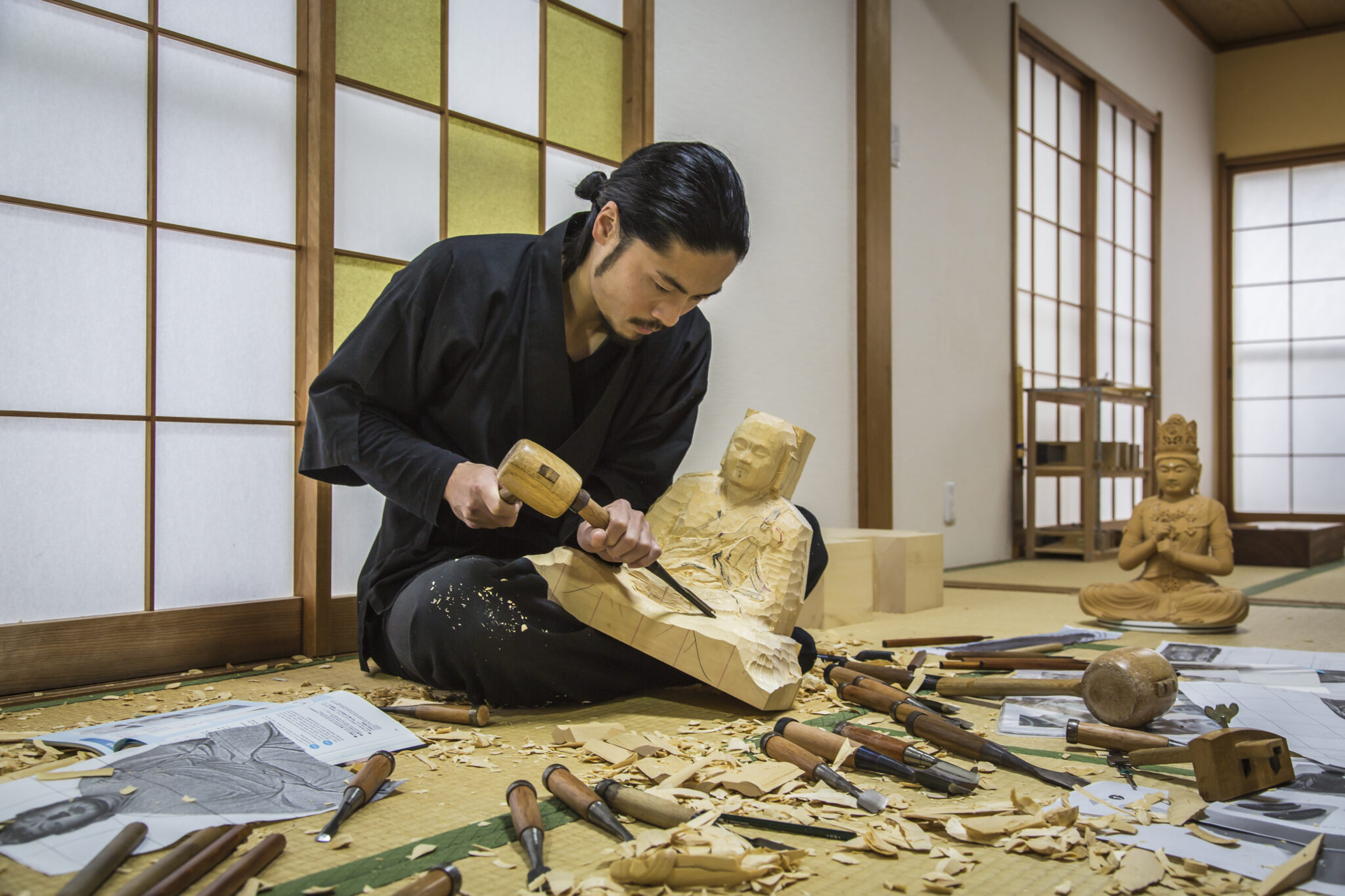 京都生まれ。 学生時代に服飾を学び、卒業後京都の仏像彫刻工房にて仏像の彩色を手掛けたことをきっかけに仏像彫刻の世界に入る。 9年間の修行の後、平成27年4月独立。 京都・西山に工房を構え「宮本工藝」を設立し、日々仏像・仏具、 その他木彫刻全般の研究、制作に励む。 学んだ服飾技術を活かし、リアリティのある衣文表現を得意とする。(京もの認定工芸士認定番号第128号)~HPより抜粋~